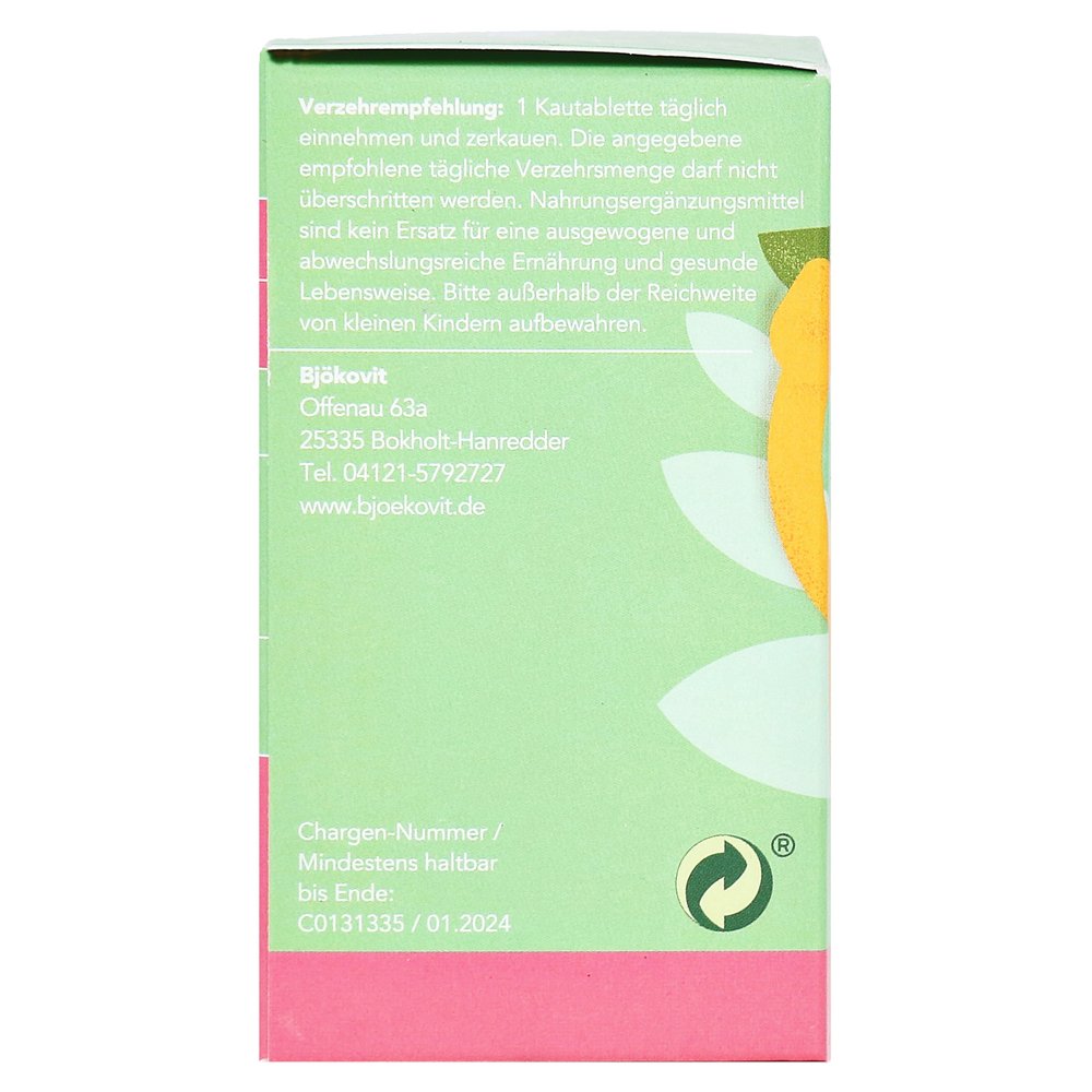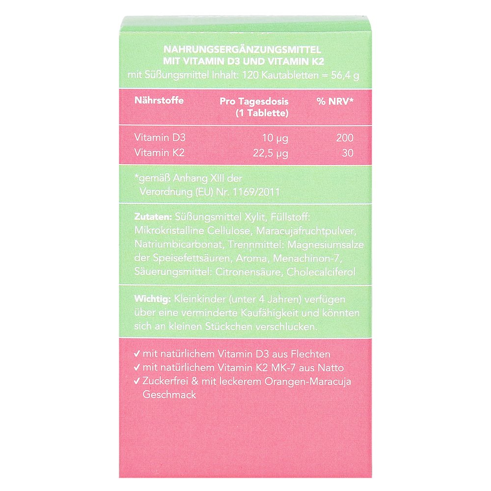 Жевательные таблетки Vegan Bjökovit содержат витамин D3 из лишайных экстрактов, а также витамин К2 из ферментированного соя и, таким образом, могут способствовать достаточной подаче с двумя витаминами.