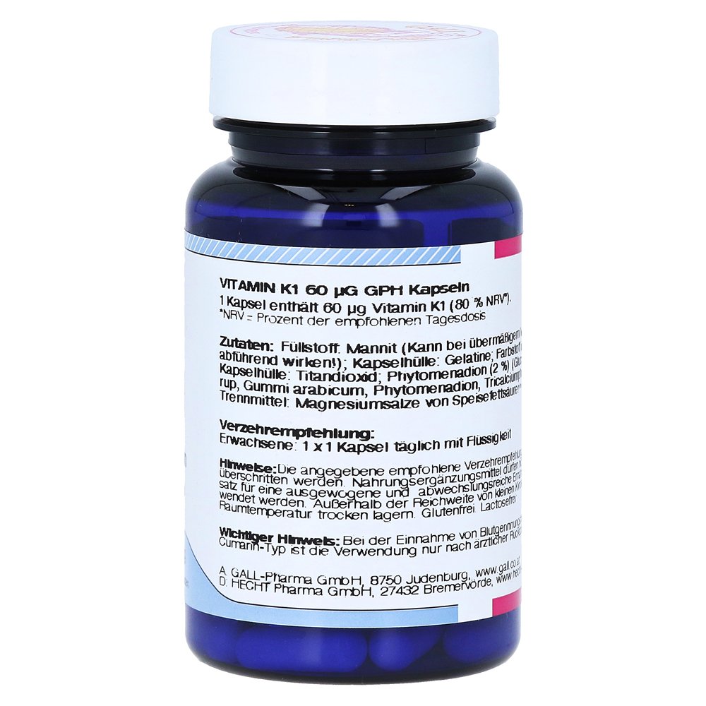 Капсулы Vitamin K1 60 мкГГ GPH содержат 60 мкг витамин К1 в твердой желатиновой капсуле. Точное требование может быть оценено только, здоровые взрослые имеют ежедневную потребность в 60 — 80 мкг (значение крыши).