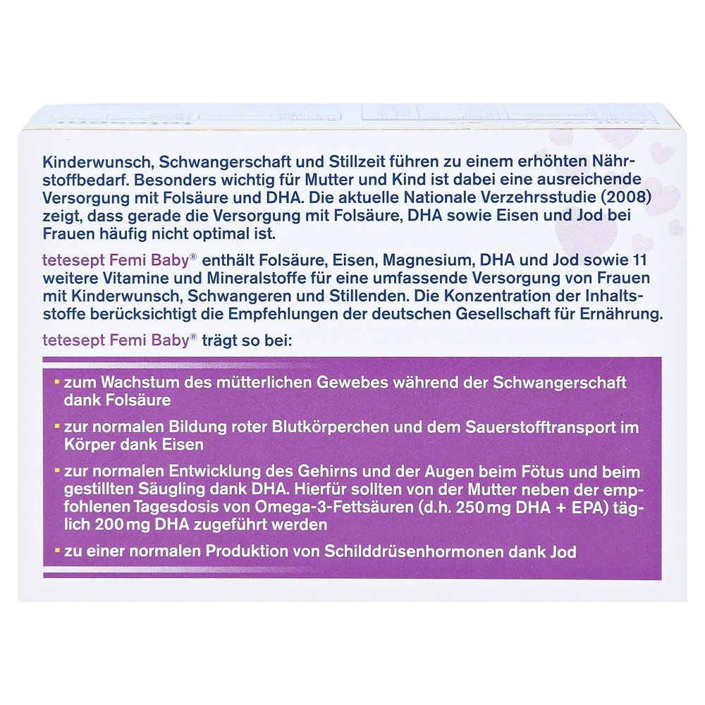 Tetesept Femi Baby поддерживает всеобъемлющую поставку фолиевой кислоты и DHA для женщин с детским желанием, беременными женщинами и матерями во время лактации. Регулярное поставку с важной омега-3-жирной кислотой DHA может оказать положительное влияние на развитие мозга и видения ребенка.