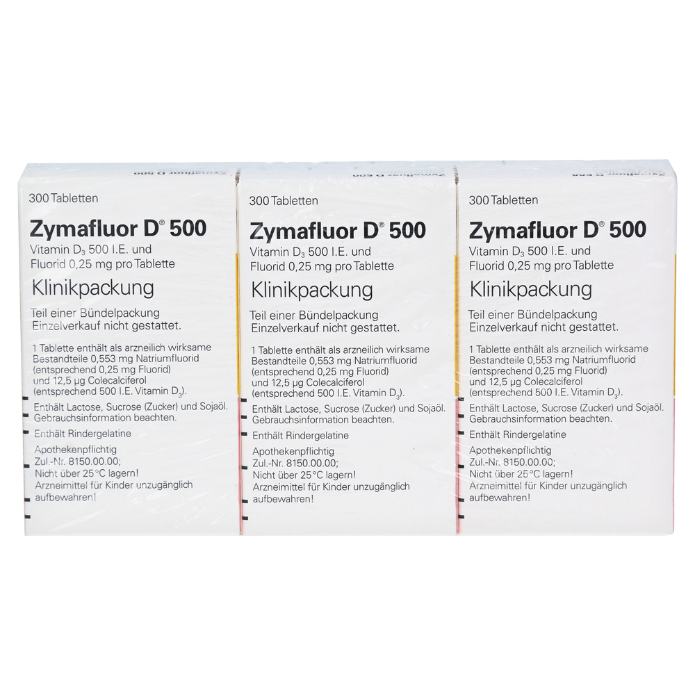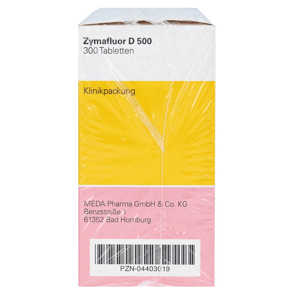 Zymafluor D 500 содержит витамин D3 500 I.E. и фторид 0,25 мг / на планшет. Это превентивное средство от кариеса и рахита и служит для использования у детей и малышей к концу второго года жизни.