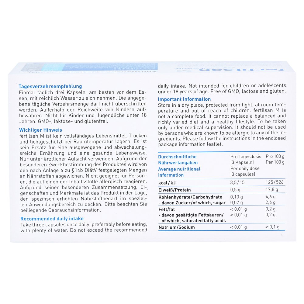 Fertilisan M не является полной едой и, следовательно, без замены сбалансированной и разнообразной диеты. Применять только при медицинском надзоре.