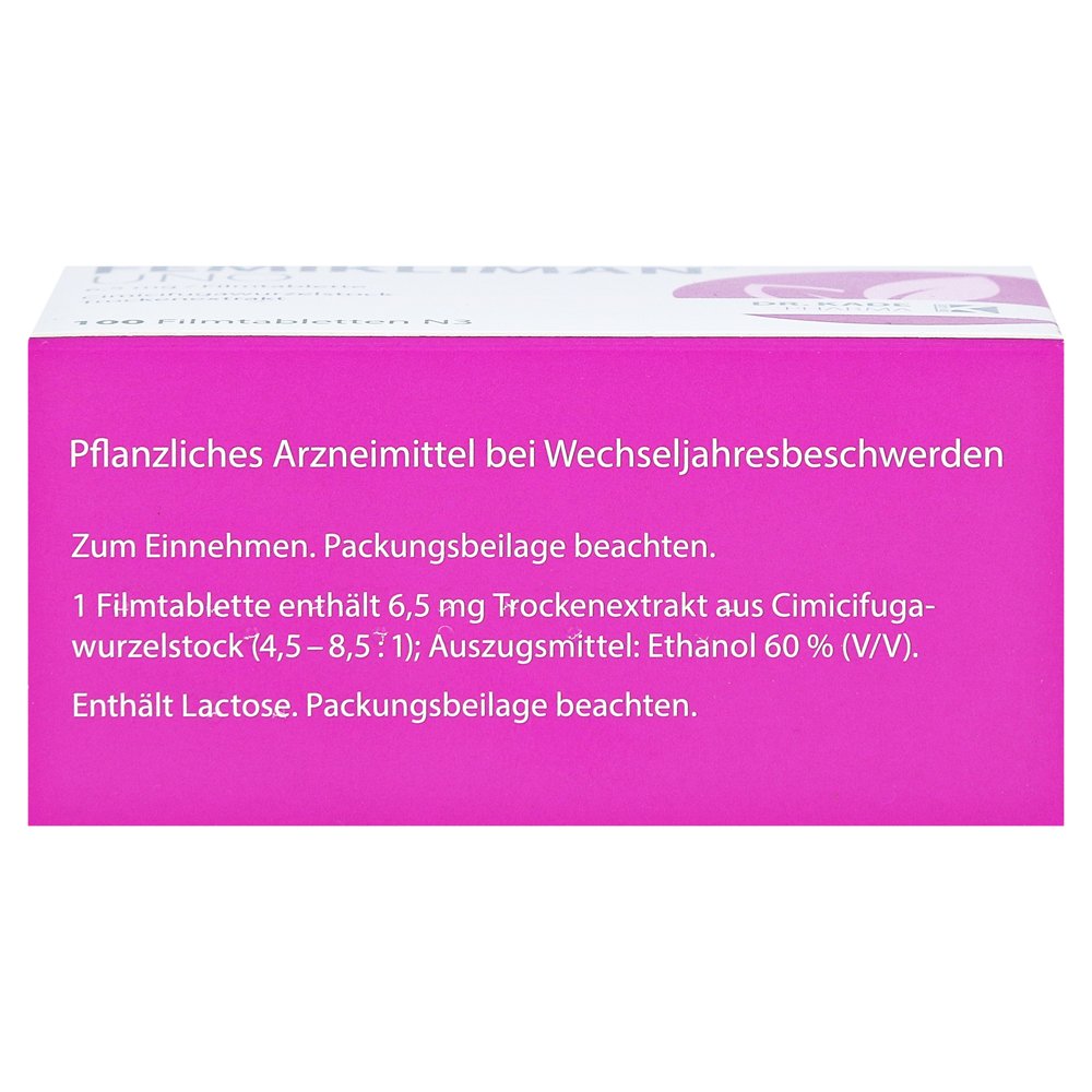 FEMIKLIMAN® UNO, 6,5 мг таблетки с покрытием с пленочным покрытием: активный ингредиент: химический экстракт Cimicifugaiselstock. Применения: FEMIKLIMAN® UNO используется для улучшения психических и нейровых жалоб из-за менопаузы. Содержит лактозу. Для рисков и побочных эффектов прочитайте листовку посылки и спросите своего врача или фармацевта! Мат. — Нет.: 2/51005328 Статус: декабрь 2012 г., гексал AG, 83607 Holzkirchen, www.hexal.de.