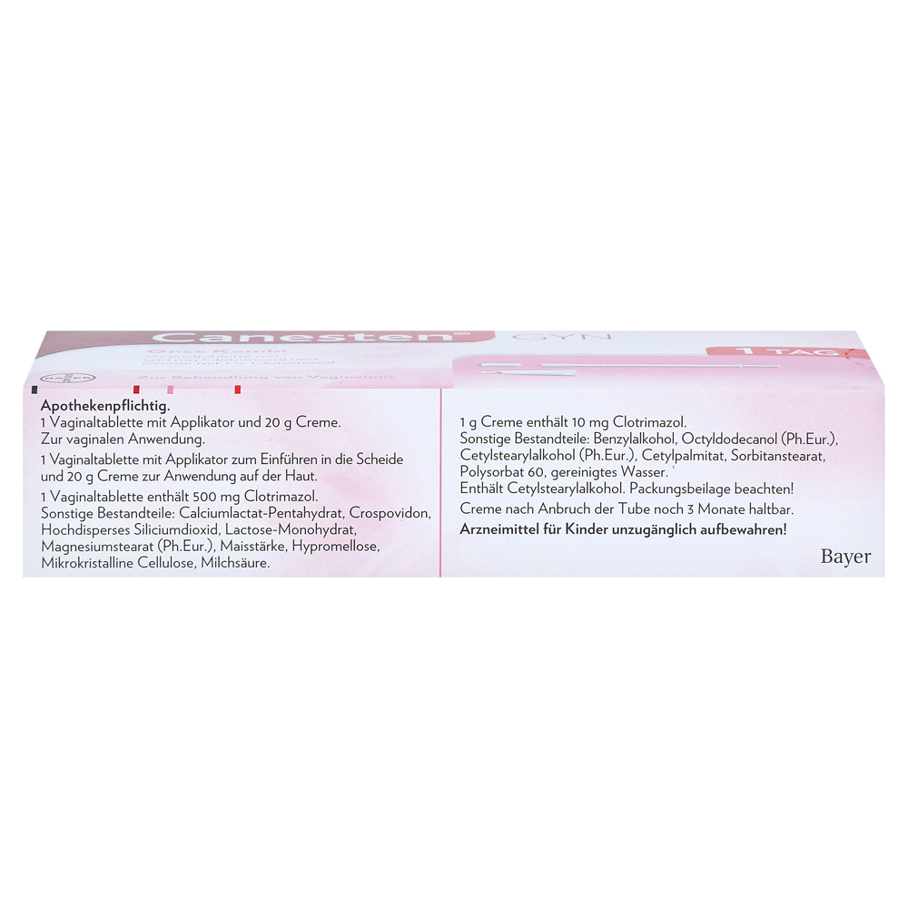 На Canesten Gyn когда-то комбинированная терапия антимикотик клотримазол ингибирует грибковый рост влагалища и борется с патогенами. Одиночная вагинальная таблетка с эффектом депозита обычно достаточна для толкания и борьбы с вагинальной грибковой инфекцией. Доказанный активный ингредиент особенно эффективен против дрожжевых Candida Albicans, что является причиной лезвии влагалища в 90 процентов всех случаев. Крем, применимый ежедневно поддерживает терапию и работает с тем же лекарством.